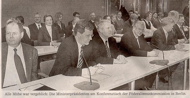 schulen bekommen. Bayerns Ministerpräsident Stoiber erklärte: "Die große Chance für eine Renovierung des Grundgesetzes ist auf Jahre vertan." Stoiber bedauerte, dass eine Entflechtung im Bereich Bildung "letztendlich nicht mit dem Bund zu vereinbaren" gewesen sei. "Es ist alles an dem einen Punkt gescheitert." Dabei hätten sich die Länder in anderen Bereichen" außerordentlich weit bewegt", sagte Stoiber. Sie seien bereit gewesen, die Zahl der im Bundesrat zustimmungspflichtigen Gesetze von jetzt 60 auf 30 Prozent zu reduzieren. Zudem hätten sie ihre Beteiligung an Strafzahlungen an die EU ebenso hingenommen wie erweiterte Zuständigkeiten des Bundeskriminalamts. Mit dem Scheitern sind die geklärten Fragen nun aber wieder vom Tisch.
