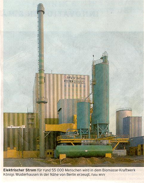 Holzhackschnitzel - wer damit eine bayerische Brettljause assoziiert gerät schnell auf den Holzweg: Der Rohstoff dient als Energieträger für Biomasse-Kraftwerke, wie eines kürzlich in der brandenburgischen Stadt Königs Wusterhausen in Betrieb ging. Die Anlage des Mannheimer Energiekonzerns MVV Energie ist, so versichern die Betreiber, das zurzeit fortschrittlichste und umweltfreundlichste Biomasse-Kraftwerk Europas in der Leistungsklasse bis 20 MW mit einem Wirkungsgrad von über 35 %.
