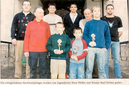In seiner Ansprache ließ Schiele das Sportjahr noch einmal Revue passieren. Dabei hob er die zahlreichen Erfolge des Nachwuchses auf Bezirksebene im Frühjahr 2004 hervor und die in Weiding durchgeführte Einzelmeisterschaft. Als besonderen Erfolg wertete der Vorstand den erneuten 2. Platz der Seniorenringer, die ohne nichtdeutsche Athleten im Bezirk Niederbayern-Oberpfalz /Inn Chiem sogar Landesliga-Absteiger AC Regensburg hinter sich lassen konnten. Von 14 in der Seniorenstaffel eingesetzten Ringern absolvierten Karl Pfeilschifter, Mario Schmid, Andreas Serve und Markus Iglhaut alle Mannschaftskämpfe der Saison. Dabei war Andreas Serve der erfolgreichste Punktesammler, gefolgt von Mario Schmid und Mannschaftssprecher Markus Iglhaut.