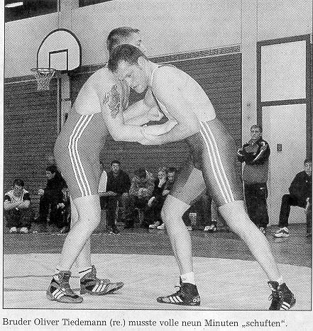 In der Klasse bis 90 kg wurden die Nerven der Zuschauer auf eine harte Belastungsprobe gestellt. Oliver Tiedemann nahm erfolgreich Bruder-Revanche gegen Peter Seidl, Geiselhöring. Selbst der ruhige Schiri kam ins Schwitzen, als nach drei Minuten und sechs Minuten einfach keine technische Wertung gefallen war und trotz aktiver Ringweise und wechselseitig angeordneter Bodenlagen ein Remis auf der Anzeige stand, das es nach dem Reglement nicht mehr gibt.