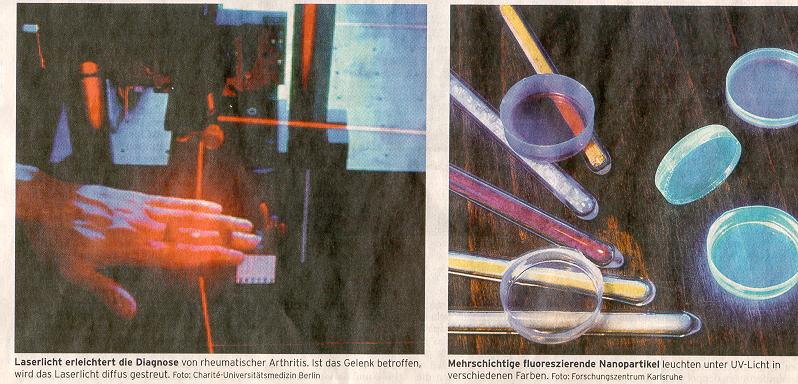 Wissenschaftler am Institut für Medizinische Physik und Lasermedizin der Charite-Universitätsmedizin Berlin und der Laser- und Medizin-Technologie GmbH in Berlin um die Physiker Jürgen Beuthan und Gerhard Müller entwickelten ein neuartiges Laserverfahren, mit dem sich Rheuma in den Fingergelenken rasch und einfach im Frühstadium feststellen, aber auch bei Therapieverlaufskontrollen beobachten lässt. Es handelt sich dabei um die so genannte optische Streulichttomographie, eine Durchleuchtungsmethode, die mit für den Körper unschädlichen Laserstrahlen im nahen Infrarot arbeitet und die Streuung von Licht im biologischen Gewebe als Informationsquelle nutzt. Die Berliner Forscher machen sich dabei das Phänomen zu eigen, dass sich ein gesundes Fingergelenk mit infrarotem Laserlicht besonders gut durchdringen lässt.