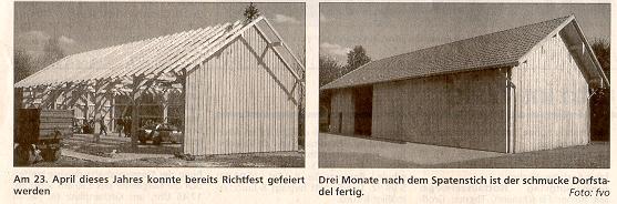 Also wurde bereits im Frühjahr mit dem Bau des 22 Meter langen und zehn Meter breiten Stadels begonnen, und die vielen freiwilligen Helfer machten sich mit großem Engagement an die Arbeit. Als Hauptverantwortliche zeigten sich hierbei Stadtrat Michael Engl und Michael Ruhland, die neben der Arbeit am Stadel auch die Organisation und die vielen Schreibarbeiten zu erledigen hatten. Bereits am 23. April wurde Richtfest gefeiert. Bis zum Johannifeuer am Samstag war der Bau in soweit fertig, dass man vor jeglichem Wetter geschützt war. Am Donnerstag erhielt der Dorfstadel seinen letzten Schliff, denn als letzte Baumaßnahme wurden die riesigen Schiebetore eingesetzt.