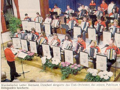 Danach war das Club-Orchester an der Reihe mit folgenden - zum Teil klassischen - Stücken: "Im Zigeunerlager", "Elvira Madigan", Potpourri "Tango ole!", "Wiener Praterleben" und "Tijuana Taxi". Auch etwas Theaterspielen war beim siebenteiligen und von Carolin Dirscherl überarbeiteten Stück "Villa Timecode" dabei. Manuela Schreiner, Monika Robl und Markus Späth waren der Steinzeit, den Neandertalern und damit dem ersten Akkordeonclub auf der Spur. Es spukte in den Zimmern einer Villa, und im letzten Zimmer konnten sie sogar eine "Rock-and-Roll-Show" mit Elvis Presley verfolgen. Der Spuk war nach verschiedenen Musikrichtungen vorbei.