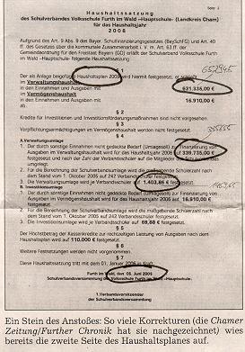 Der nächste Skandal in Furth im Wald: der Haushalt der Schulverbände von Grund- und Hauptschule konnte am Dienstag nicht verabschiedet werden, weil Stadtkämmerer Igl die Haushaltsunterlagen einfach vom Vorjahr kopiert und nicht vollständig ausgebessert hatte und die Rechnungsprüfung zum Teil eklatante Unstimmigkeiten ergab. Unter anderem sind 130000 D-Mark mehr Miete vom Schulverband verlangt worden, zum anderen wurden genehmigte Beträge einfach durchgestrichen und erhöht. In rund zwei Wochen wird der Schulverband, dem Vertreter von Furth im Wald, Arnschwang und Weiding angehören, einen neuen Anlauf unternehmen, um den Etat zu beschließen.