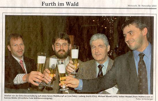 Michael Mandl: Was mir an den Wahlkämpfen und Initiativen der Mitkandidaten gefällt? Es war von Anfang an klar, dass alle Kandidaten inhaltlich nahezu ähnliche Aussagen machen würden, weil die brennenden Themen ja in der Luft liegen. Deswegen will ich jeweils einen interessanten Aspekt der Mitkandidaten herausheben: Bei Volker Heiduk ist die Homepage der Freien Wähler interessant, wenngleich man dort selber Probleme mit der Abstimmung zugibt. Bei Ludwig Kreitl war ich überrascht, dass er den Stil von Bürgermeister Macho gegenüber den Rathausbediensteten kritisiert und sich sogar vom Further Ehrenbürger Edmund Stoiber distanziert hat. Die Bewerbung von Johannes Müller zeigt ehrlich auf, dass innerhalb der CSU nicht nur in Bayern, sondern auch im Ortsverein Furth im Wald Diskussionsbedarf besteht und die CSU keineswegs so einig ist, wie nach außen getan wird.