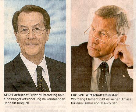Doch für Wirtschaftsminister Wolfgang Clement gibt es derzeit keinen Anlass für solche Diskussion und der SPD-Landesvorsitzende von NordrheinWestfalen, Harald Schartau, warnt vor übertriebener Eile: Zu viele Probleme seien bei der Bürgerversicherung noch zu klären.