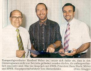 Manfred Weber hatte, wie bereits berichtet, zuvor im Regionalausschuss des Europäischen Parlamentes erreicht, dass in der neuen Förderperiode (2007 bis 2013) in der so genannten "neuen Ziel-2-Region", unter die auch die Grenzregionen fallen werden, nicht nur Betriebe gefördert werden dürfen, die außergewöhnlich innovativ sind. "Wenn künftig nur das Innovationskriterium für die Unternehmensförderung Gültigkeit hätte, würden große Teile des Handwerks nicht mehr wie bisher gefördert werden dürfen", erläutert Toni Hinterdobler, Hauptgeschäftsführer der Handwerkskammer. Seinen Angaben nach hätte dies besonders den Handwerkern der Grenzregion zu schaffen gemacht, da sie direkt an die Höchstfördergebiete der Tschechischen Republik angrenzen.