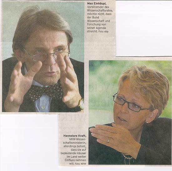 Auf der anderen Seite sind die Landesminister nicht gewillt, lieb gewonnene Kompetenzen und imageträchtige Projekte aufzugeben. NRW-Wissenschaftsministerin Hannelore Kraft nennt in der "Rheinischen Post" ein Beispiel: "Nehmen Sie als Beispiel die Großforschungsanlage Jülich: Dort arbeii%n 4500 Leute. Viele von ihnen köo@'rieren eng mit einer oder mehreren Universitäten im Land ... Es gibt eine hohe Zahl von Doppelberuftingen zwischen Jiflich und einer NRW-Universität. Damit ist Jülich auch ein wichtiges strukturpolitisches Instrument für NRW. Auf eine so bedeutende Einrichtung möchte ich Einfluss behalten."