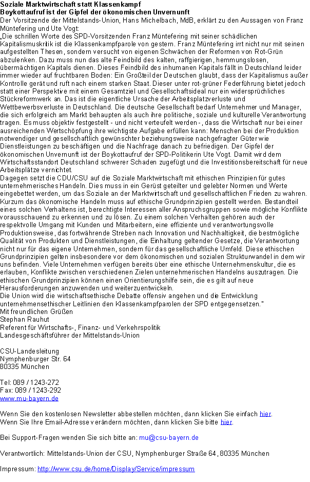 Der SPD-Vorsitzende hatte in der vergangenen Woche die "wachsende Macht des Kapitals" als Gefahr für die Demokratie bezeichnet. Stoiber sprach von "platter Kapitalismuskritik". Münteferings Attacke sei "eine Panikreaktion" und zeige auch die Orientierungslosigkeit Schröders: "Auf der einen Seite ist er der Genosse der Bosse, auf der anderen Seite teilt er die pauschale Beschimpfung. Das wird international nicht ohne Wirkung bleiben."
