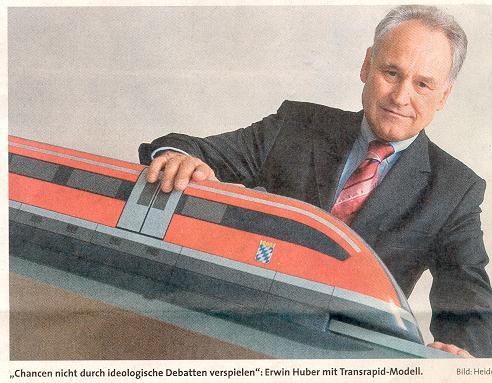 Bavernkurier: Kritiker sagen, eine Exress-S-Bahn würde den selben Zweck erfüllen.Huber:Da liegen sie falsch. Der Transrapid ermöglicht nicht nur die schnellste Verbindung, sondern lässt auch den größten Zuwachs an Fahrgästen erwarten. Auch wäre die Finanzierung einer Express-S-Bahn weitaus schwieriger als die des Transrapids, für den beim Bund ein Sondertopf zur Verfügung steht. Dagegen müsste die Express-S-Bahn aus den allgemeinen Nahverkehrsmitteln finanziert werden und stünde so in Konkurrenz zu allen anderen bayerischen Projekten. Während der Transrapid zudem eigenwirtschaftlich von der Bahn betrieben werden soll, müsste der Freistaat die Verkehrsleistungen einer Express-S-Bahn ebenfalls aus Regionalisierungsmitteln bestellen und zahlen.