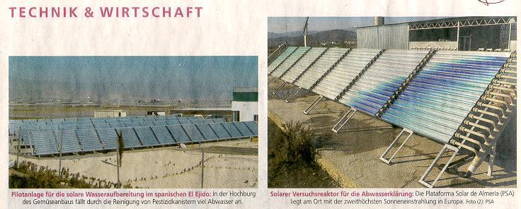 In Südspanien nutzen die dortigen Landwirte die Sonne nicht nur für sonnengereiftes Gemüse. Solarkraft aus Vakuum-Röhrenkollektoren, kombiniert mit einem Oxidationsprozess, hilft dort, pestizidbelasteten Abwässern des bäuerlichen Fleißes zu Leibe zu rücken. Optimiert wird das Ganze mit einem zweiten Prozess, der die Reste auf Bakterienbasis klärt. Die Methode verspricht auch für die chemische Industrie interessant zu sein.