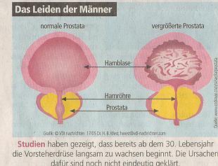 Umfangreiche Autopsie-Studien haben gezeigt, dass bereits ab dem 30. Lebensjahr die Vorsteherdrüse langsam zu wachsen beginnt. Die Ursachen dafür sind noch nicht eindeutig geklärt. Mediziner vermuten, dass hormongesteuerte Alterungsprozesse dabei eine Rolle spielen. Ab dem 75. Lebensjahr ist die Gewebewucherung dann bei nahezu allen Männern nachzuweisen. Wenn sich akute Probleme beim Wasserlassen ergeben, spricht man vom benignen Prostata-Syndrom. Mindestens zwei Millionen Männer hier zu Lande leiden darunter. Unterbleibt in diesem fortgeschrittenen Stadium eine entsprechende Therapie, können sich durch Keime häufige Harnwegsinfektionen mit Blasensteinbildung, Harnsperre sowie Harnstauung bis hin zum Nierenversagen bilden.