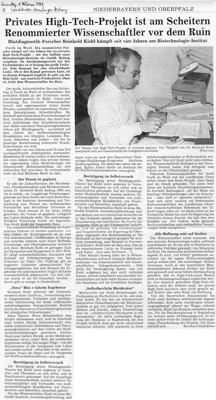 Mittlerweile hat Kiehl Bewerbungen um Professuren an Hochschulen im In- und Ausland laufen. Er hat sein als bahnbrechend deklariertes Zukunftsprojekt der Molekularmedizin so gut wie aufgegeben. Und äußert Mißmut und Zweifel, nahezu Verzweiflung, über die "selbstherrlichen Bürokraten in den Amtsstuben" der dafür zuständigen Regierung der Oberpfalz in Regensburg, die sein Projekt fachlich doch gar nicht ausreichend beurteilen könnten, sich ansonsten in ihren Ablehnungsbescheiden in Widersprüche verwickelten. Nun will Kiehl nicht mehr stillhalten. Wissenschaftliche Kollegen in den Vereinigten Staaten haben ihm dringend zum Schritt an die Öffentlichkeit geraten.