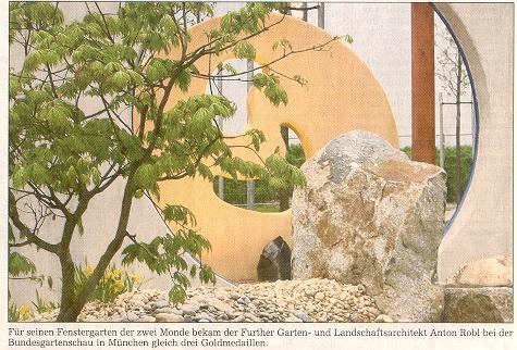Furth im Wald. (ab) Mit seinem Fenstergarten der zwei Monde landete der Further Garten- und Landschaftsarchitekt Anton Robl bei der Bundesgartenschau (BUGA) in München einen Volltreffer: Die Bewertungskommission für den Landschaftsgärtnerischen Bauwettbewerb der BUGA München 2005 erkannte ihm drei Goldmedaillen zu. Robl erhielt diese Auszeichnungen für "hervorragende Arbeiten auf dem BUGA-Gelände, die Anlage der Grundstrukturen Gartendetail, der Anlage von befestigten Flächen und Teichbauarbeiten sowie für Pflanz- und Pflegearbeiten" heißt es in der Laudatio.