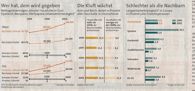 Das Thema ist politisch heikel. Auf der einen Seite tun die Spitzenverdiener im Land so, als sei es normal, dass sie ein paar Millionen Euro im Jahr verdienen. Im Vergleich zu den USA sei das eher bescheiden, argumentieren die Einkommensmillionäre vom Schlag des Bankers Josef Ackermann (7,7 Millionen Euro) oder des Daimler-Chefs Jürgen Schrempp (4,2 Millionen Euro). Auf der anderen, der Schattenseite, wächst die Angst vor der Armut. Auf den Straßen der Großstädte wird mehr gebettelt, immer mehr Kinder werden Empfänger von Sozialhilfe, die Schlangen in den Suppenküchen werden länger, Alkohol scheint vielen der einzige Ausweg. »Armut ist jetzt ganz normal«, verkündete unlängst das Caritas-Magazin Sozialcourage auf der Titelseite. Und HartzIV, nicht nur von der PDS als »Armut per Gesetz« geschmäht, vereint die Menschen zu langen Protestmärschen aus Furcht, es könnte noch schlimmer kommen.
