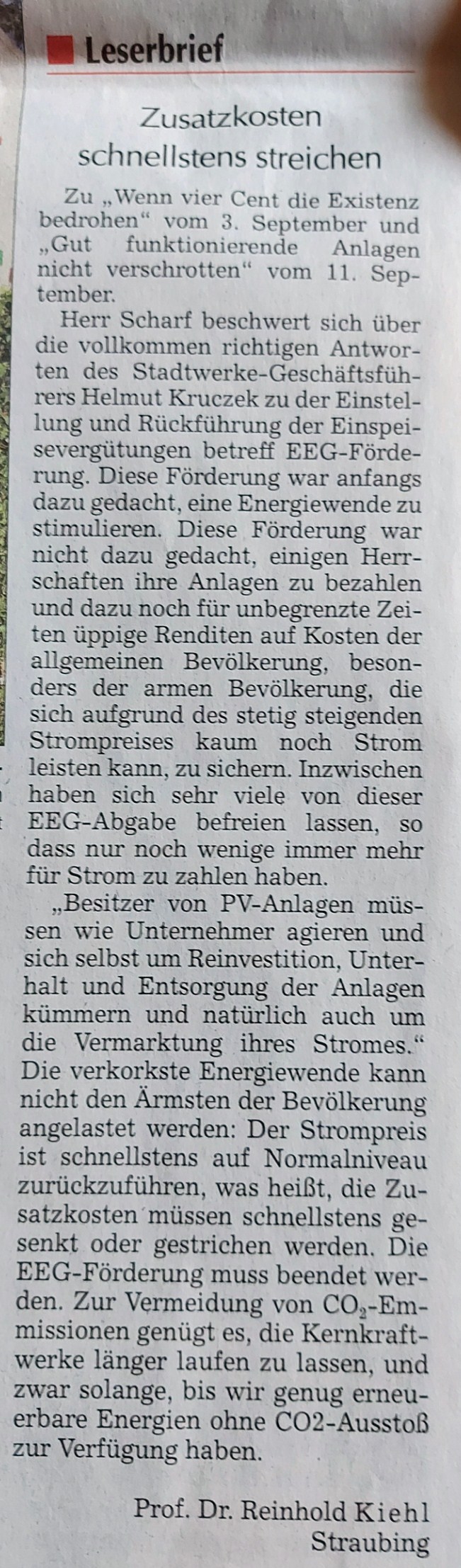 Sehr geehrte Damen und Herren, hiermit möchte ich auf den Artikel und die Antwort darauf wie folgend antworten. Herr Scharf beschwert sich über die vollkommen richtigen Antworten des Stadtwerke-Geschäftsführers Helmut Kruczek zu der Einstellung und Rückführung der Einspeisevergütungen betreff EEG-Förderung. Diese Förderung war Anfangs dazu gedacht eine Energiewende zu stimulieren. Diese Förderung war nicht dazu gedacht, einigen Herrschaften ihre Anlagen zu bezahlen und dazu noch für unbegrenzte Zeiten üppige Renditen auf Kosten der allgemeinen Bevölkerung, besonders der armen Bevölkerung, die sich aufgrund des stetig steigenden Strompreises kaum noch Strom leisten kann, zu sichern. Inzwischen haben sich sehr viele von dieser EEG-Abgabe befreien lassen, so daß nur noch wenige immer mehr für Strom zu zahlen haben. "Besitzer von PV-Anlagen müssen wie Unternehmer agieren und sich selbst um Reinvestition, Unterhalt und Entsorgung der Anlagen kümmern und natürlich auch um die Vermarktung ihres Stromes." Die verkorkste Energiewende kann nicht den Ärmsten der Bevölkerung angelastet werden: Der Strompreis ist schnellstens auf Normalniveaux zurückzuführen, was heist, die Zusatzkosten müssen schnellstens gesenkt oder gestrichen werden. Die EEG-Förderung muß beendet werden. Zur Vermeidung von CO2 Emmissionen genügt es, die Kernkraftwerke länger laufen zu lassen, und zwar solange, bis wir genug erneuerbare Energien ohne CO2-Ausstoß zur Verfügung haben. Mit freundlichen Grüßen Prof. Dr. Reinhold Kiehl Straubing, tel.094219298300